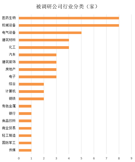 按行业分类看,被调研公司中,医药生物和机械设备两大行业被调研的公司数量并列首位,均有8家公司被调研,电气设备、建筑材料、化工等行业被调研的数量也较多。