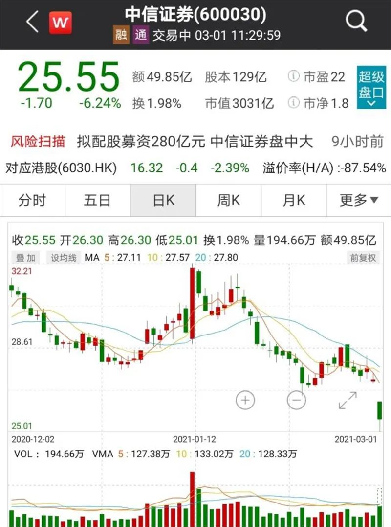 虽然今日早盘指数集体反弹,但还有部分指标股出现较大幅度回撤,其中以中信证券最为显眼。