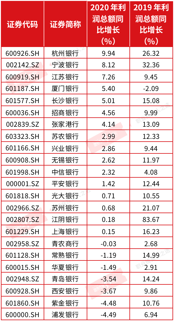 这样的“限制”也是给银行直接戴上了“紧箍咒”,而在其2020年整体业绩增速下滑的情况下(见表2),其2021年的业绩表现已可以预见。不过,这之中也有部分银行或许能抗住“压力”,如2020年利润总额同比增速出现大幅提升的厦门银行,2020年利润总额同比增速下滑幅度较小的招商银行等。