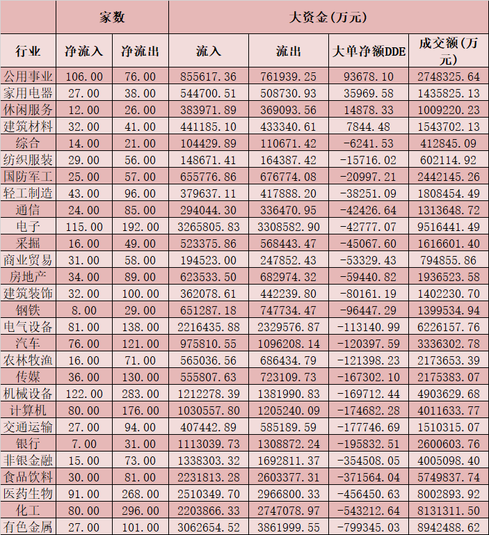 从资金层面看,周二,A股大单资金整体净流出411.23亿元,其中,有1226只个股呈现资金净流入,2854只个股呈现资金净流出。从申万一级的28个行业来看,有4个行业均现资金净流入态势,其中,公用事业以9.37亿元大单资金净流入居首位,紧随其后的家用电器行业,大单资金净流入3.60亿元,休闲服务和建筑材料等行业也均实现资金净流入。