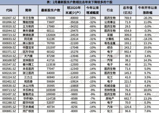 Choice数据显示,牛年开市以来有580余家A股上市公司在互动平台披露了最新的股东户数。梳理可见,这些公司中,若剔除2020年下半年后上市的次新股,则2月中下旬最新股东户数相比2020年末降幅较大的个股主要集中在医药生物、汽车、电子、化工等板块。