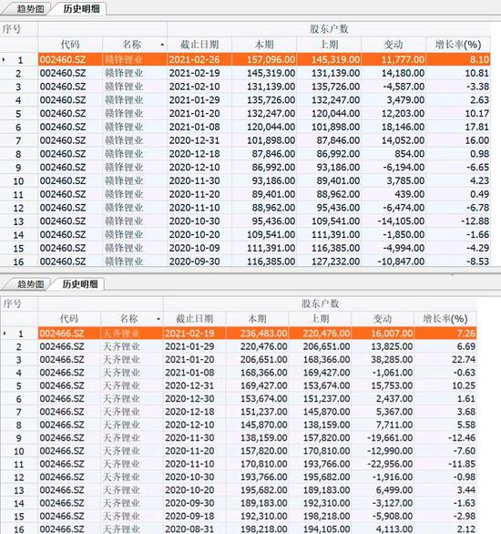 可见,赣锋锂业、天齐锂业等两大锂资源龙头股近期筹码快速分散。值得一提的是,从两只股票的股东户数变化看,它们在2020年10月至11月间股东户数曾快速下降。市场人士分析称,彼时正是有色金属板块见底,机构资金大幅吸筹之时。