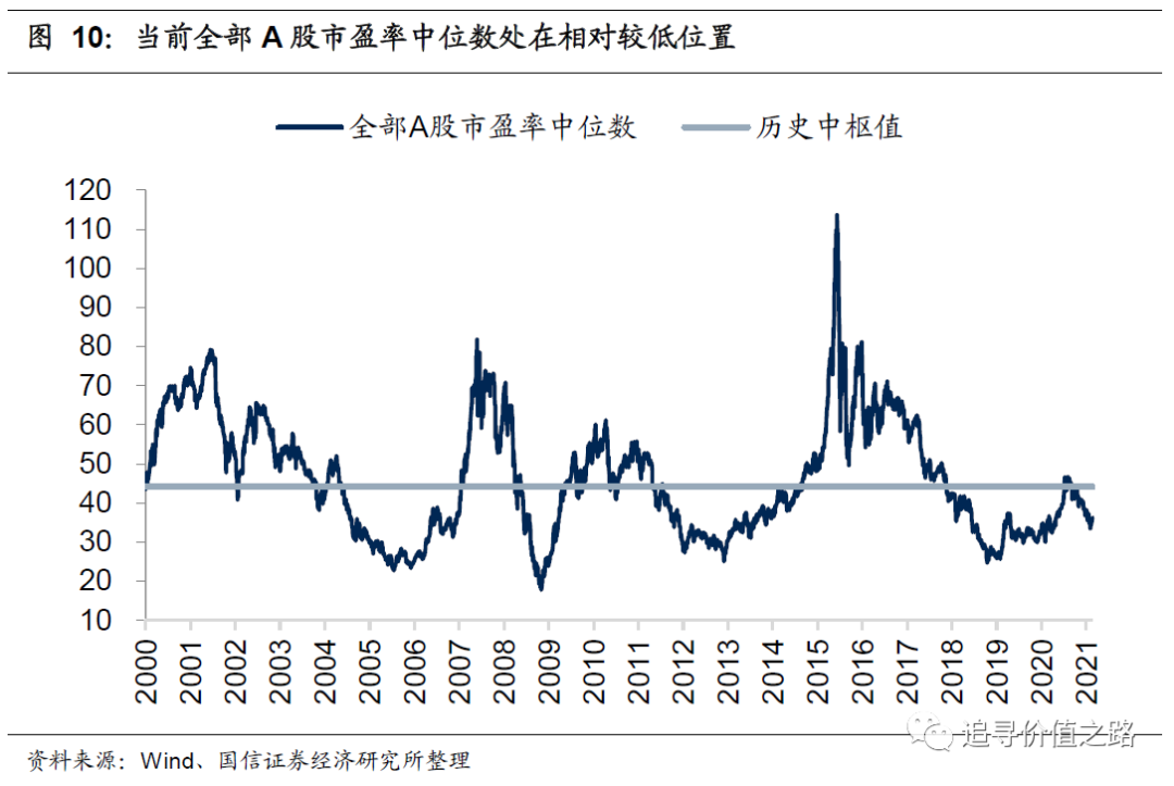 另一方面需要特别注意的是,从目前A股市场的整体估值水平来看,实际上并不高。全部A股市盈率的中位数还没有达到2000年以来的均值。在目前整体经济周期依然处于向上复苏的阶段中,这意味着市场还会有很多机会产生,研究机构判断行情发展依然是向上的趋势。