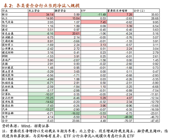 【资金·众寡】新成立公募基金回升,内外资加仓银行。北上资金当周净流出8.4亿元,净流出规模收窄;融资资金前四个交易日合计净流入22.7亿元;新成立偏股类公募基金559亿份,较前期略有回升;ETF延续逆势申购,净申购32.4亿份。行业偏好上,北上资金净买入银行、化工、交运等;融资净买入有色金属、化工、银行等;宽基指数类ETF以净申购为主,消费、医药ETF净申购;金融地产类ETF赎回。重要股东净减持和计划减持规模均有所扩大。