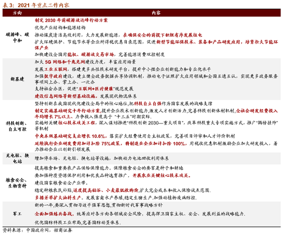 整体来看,本次政府工作报告符合预期,与十九届五中全会以及去年年底召开的中央经济工作会议基调基本一致,跟2020和2019年对比在工作重心方面有所变化,突出表现为淡化总量目标,产业政策层面笔墨更浓。