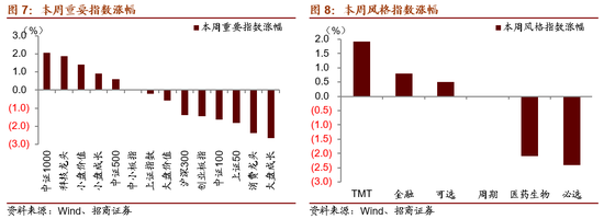 本周市场下跌,Wind全A指数周度下跌0.13%,创业板指下跌1.45%,沪深300跌1.39%。本周涨幅居前的主要为稀土、覆铜板、钨矿相关主题。