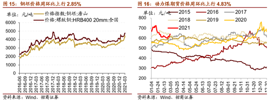 煤炭方面,秦皇岛港动力煤报价下降,京唐港山西主焦煤库提价与上周持平,焦炭、焦煤期货结算价格下行,动力煤期货结算价格上涨。截至3月4日,秦皇岛港动力煤报价575.8元/吨,周环比下降6.37%;截至3月5日,京唐港山西主焦煤库提价报1690.0元/吨,与上周持平。截至3月5日,焦炭期货结算价收于2370.0元/吨,周环比下降7.39%;焦煤期货结算价收于1478.0元/吨,周环比下降0.40%;动力煤期货结算价为642.0元/吨,周环比上涨4.83%。