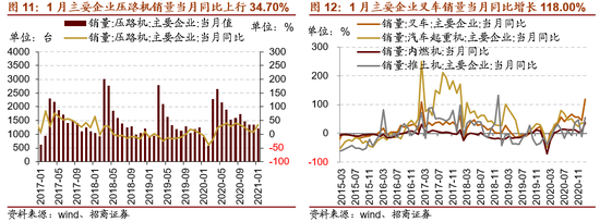 1月份主要企业压路机销量同比增幅扩大,推土机、叉车、内燃机同比增幅均扩大,汽车起重机同比增幅收窄。1月主要企业压路机销量为1219台,同比增长34.70%,增幅较上月扩大27.31个百分点。