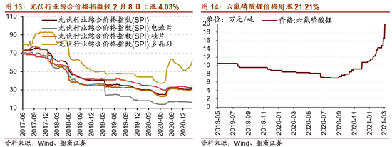光伏价格指数上行。截至2月26日,光伏行业综合价格指数较2月8日上涨4.03%至32.23,多晶硅价格指数较2月8日上涨13.04%至64.40,硅片价格指数较2月8日上涨2.20%至30.67,电池片价格指数维持在16.66,组件价格指数上涨1.36%至32.8。本周电解液价格涨幅较大,电解镍、电解钴价格下降。截至3月5日,电解液溶剂DMC价格周涨1.11%至9100.0元/吨,月环比上升26.39%;截至3月5日,六氟磷酸锂价格周涨21.21%至20.00万元/吨,月环比增长40.35%。在正极材料方面,截至3月5日,电解镍现货均价较上周下行13.84%至124500.0元/吨;电解锰市场平均价格维持在16800.0元/吨。在锂原材料方面,截至3月5日,电池级碳酸锂现货价格较上周上涨5.26%至80000.0元/吨;氢氧化锂价格周涨3.13%至66000.0元/吨。钴产品中,截至3月5日,电解钴价格周跌10.72%至358000.0元/吨。