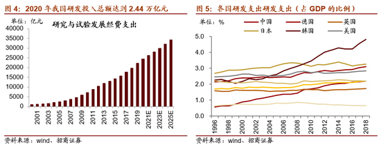 “十三五”以来我国科技实力和创新能力大幅提升。全社会研发投入总金额从2015年的1.42万亿增长至2020年的2.4万亿元,累计增长72.38%。根据十四五期间按照7%的年均增速测算,预计到2025年全社会研发投入总额将达到3.4万亿元。