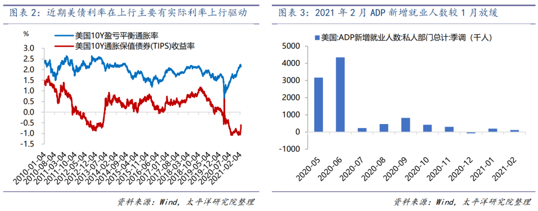 重申美联储政策未到转向之时,但由于市场已成为货币收紧的“惊弓之鸟”,收紧预期易引发情绪反复,造成市场波动加大。目前10Y美债利率仅恢复到疫情前2019年的低位水平,并未过高。近期美联储所释放的信号均偏鸽派,更强调“实质性”通胀,美国2月ADP新增就业人数最新值为11.7万人,前值19.5万人,近期美国未有明显改观的就业和通胀数据,也显示美联储短期难以退出宽松。