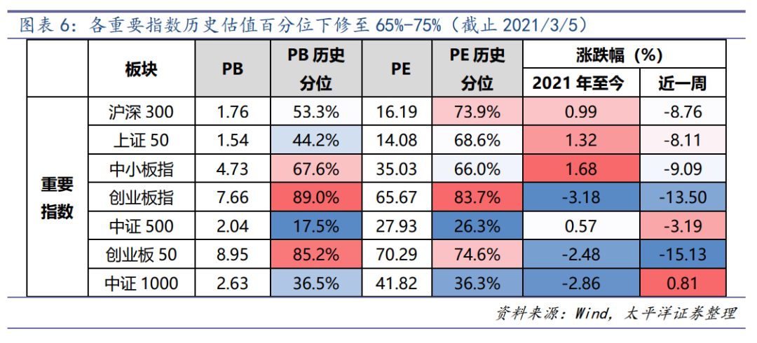此前我们判断“抱团股”深度回调的主要原因在于国内外微观资金的问题,微观主流资金的撤出和放缓带来前期“抱团股”的杀估值。其中,市场波动加大过程中公募会产生赎回和调仓压力,此前基金经理暂停申购、控制规模的动作便是应对该风险采取的主动措施。截止3月5日,2021年以来目前市场上136只市值超千亿的龙头股中有103只换手率超50%,48只换手率超100%,2月18日以来,上证综指累计下跌4.19%,单日振幅均在2%左右,大市值公司的较大波动明显影响了A股大盘。