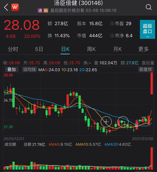 受此影响,汤臣倍健3月8日股价高开,收盘报28.08元/股,涨幅达20%。