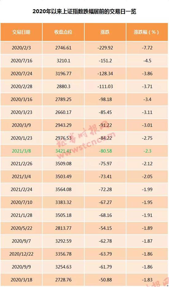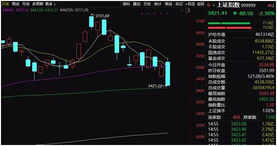 上证指数下跌80.58点,报3421.41点,跌幅为2.30%,这一跌幅创下2020年7月24日之后,接近8个月最大单日跌幅。
