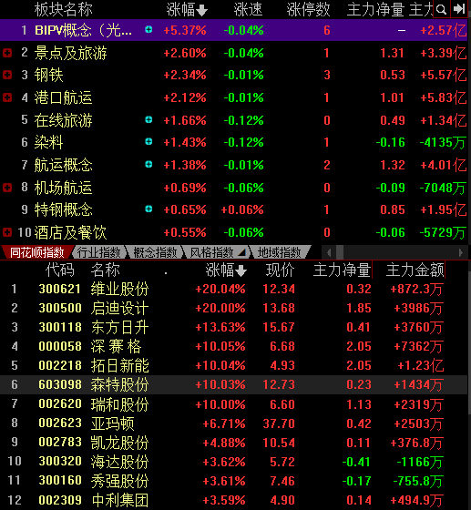 板块方面,光伏板块细分领域BIPV概念股高开高走,强势领涨。钢铁、有色钴等板块盘中走高。油气采掘板块大跌,军工、农业等跌幅居前。