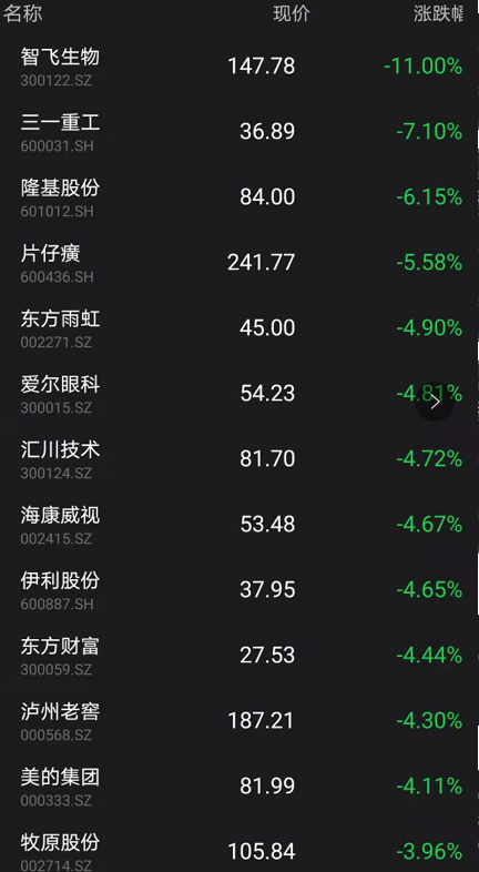 智飞生物跌11%、三一重工跌超7%,隆基股份跌超6%……