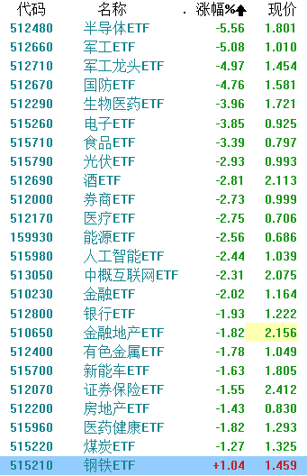 半导体、军工ETF跌超5%,生物医药ETF跌3.96%,食品光伏ETF均跌3%左右,钢铁ETF一度涨近5%,但午后逐步收窄涨幅。