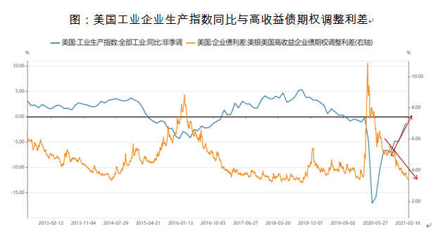 我们一般用企业高收益债期权调整利差来跟踪投资者风险偏好的变化,这一指标能够代表企业经营的违约风险是否上升,宏观经济趋势是否发生大的变化。实际上我们能够看到,尽管美国10年期国债收益率上升给市场带来风险波动,但美国高收益债期权调整利差并未出现明显上行,体现企业信用利差持续回落,经济依然维持向上复苏趋势。