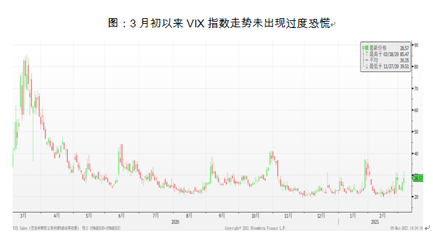 所以标普500指数在下跌过程中,可以通过观察VIX指数的变化,来观察市场对标普500持续下跌的恐慌程度。当2月25日美债收益率突破1.6%,美股出现大调整时,VIX恐慌情绪比1月29日鲍威尔讲话前的恐慌程度要来得小,说明美股市场对美债收益率快速上升的恐慌没有对美联储货币收紧恐慌来得大。