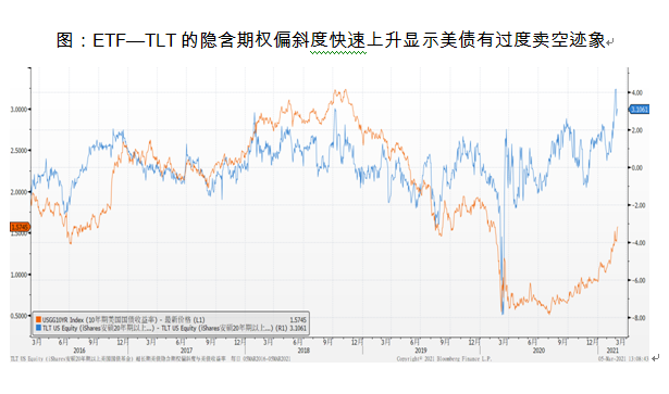 其二,国债的抛售与较低的买盘。2021年1月初,美债收益率升破1%之后,短短2个月,美债收益率就升破1.50%,经济复苏预期使美联储并未积极表示愿意承接下跌的国债,市场缺少买盘,而银行的抛售仍在持续,拥挤的抛盘以及可能的程序化交易,导致美债出现超卖的迹象——超长期美债ETF—TLT的隐含期权偏斜度(Option Skew)快速上升,波动率曲线持续陡峭化,暗示市场对于利率上行的押注处于极值水平(过度卖空)。