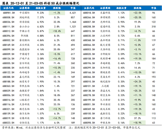 2020年12月以来,A股市场先后经历了大幅上涨和近期调整,2012年12月1日至2021年3月5日间,万得全A最高上涨8.2%、期间收涨2.9%,创业板指最高上涨27.5%、期间收涨9.1%,科创50指数最高上涨8.2%,期间收跌2.9%。科创50指数表现相对弱势,一方面和其密集的行业分布有关。科创50指数成立初期可选样本空间有限,因此权重股集中在半导体行业且龙头个股占比极大,中芯国际-U、沪硅产业-U、华润微合计24%,指数风格与年初热门的消费成长板块并不完全相似,相对表现偏弱;另一方面,指数内的部分成分股对于指数表现也有所拖累。科创50中23只成分股权重低于1%,其市值普遍在100亿以下,且伴随着科创板分化不断加大,2020年12月至今平均下跌3.5%,对于指数表现有所拖累。分阶段来看,科创50指数汇总中大权重公司表现均明显优于排名靠后的公司。