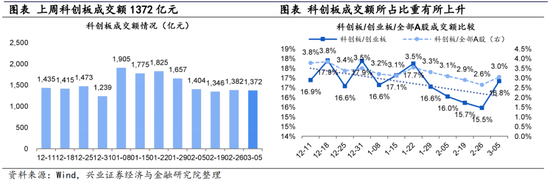 上周科创板成交额1372亿元,较前两周下降10亿元。科创板成交额/创业板成交额为16.8%,较前两周15.5%上升1.3个百分点;科创板成交额/全部A股成交额为3.0%,较前两周2.6%上升0.4个百分点。