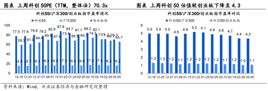 从整体法(剔除负值)PE(TTM)来看,科创50估值从前两周71.2下降至上周末的70.3x。与沪深300相比,科创板估值从4.4下降至4.3,和创业板指比较,科创板估值上升至1.1。