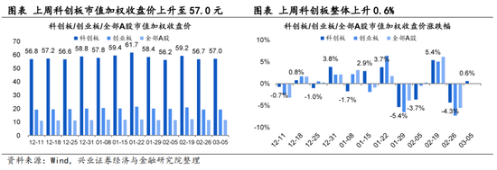 科创板上周整体上升0.6%。以市值加权收盘价衡量,上周科创板从56.7上升至57.0,涨幅0.6%;与之对应,创业板加权收盘价和前两周比保持不变;全部A股加权收盘价和前两周比保持不变。
