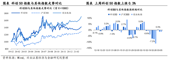 科创50上周上升0.3%。上周科创50从1325.6上升至1329.8,涨幅0.3%;与之对应,沪深300下跌1.4%,创业板指下跌1.45%。