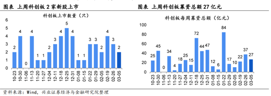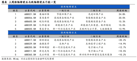 3)行情方面,以市值加权收盘价衡量,上周科创板整体涨幅0.6%,创业板较上周保持不变;全部A股较上周保持不变。上市满两周的个股中,奥福环保、莱伯泰科、皖仪科技、亿华通-U、慧辰资讯分列涨幅榜前五。