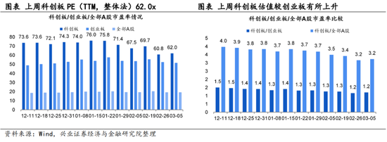 从整体法(剔除负值)PE(TTM)来看,科创板估值上升至62.0x,较前两周的60.8上升1.2。与创业板比较,科创板估值比和前两周比保持不变;与全部A股比较,科创板估值比和前两周比保持不变。