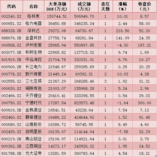 一、周二(3月9日)DDE大单资金净买入TOP20