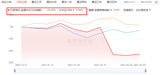 但不可思议的是,截至3月5日,上述基金年内收益为-22.68%。相较对标的小盘股指数中证1000,金锝的产品跑输基准约25个百分点。