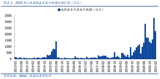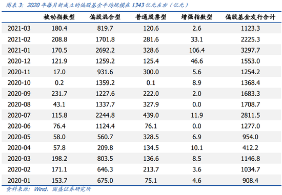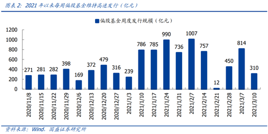 从偏股基金发行的情况来看,当前仍然维持高速发行,后续也有望维持平稳。2020年每月新成立偏股基金规模平均水平在1343亿元左右,而2021年前3个月基金发行规模维持高位:1月创出单月新高达到3298亿元;2月由于春节假期交易日减少一周,但整体发行规模仍达到了2225亿元;3月截至10号,发行规模已经达到1123亿元(3月第一周发行814亿元,第二周前3个交易日发行310亿元)。