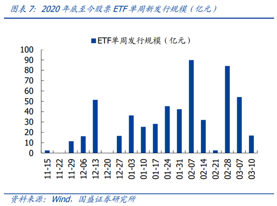 考虑到当前偏股基金赎回数据的不可得,我们用股票型ETF基金的高频数据来进行间接的验证。截至到2021年3月10日,我们看到股票ETF基金的总份额持续增加,即使将2021年以来新发行的ETF基金剔除后,我们看到存量ETF基金也是净申购的,这与我们对偏股基金的判断是一致的。