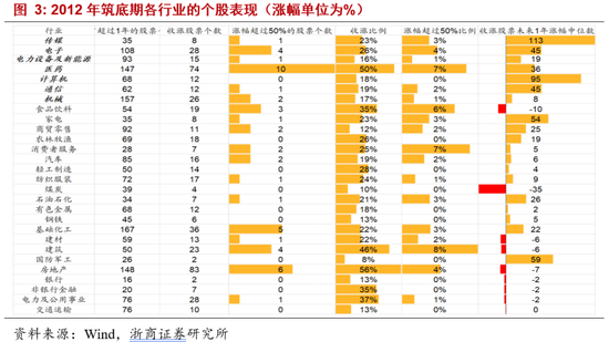 具体来看,剔除上市不足1年的新股后,在2012年的筑底期,传媒、计算机、通信、电子等行业的后续牛股在此阶段已经崭露头角。数据上,传媒行业中,筑底期收涨的个股,在后续一年的涨幅中位数达113%;计算机涨幅中位数达95%;电子和通信分别达45%。