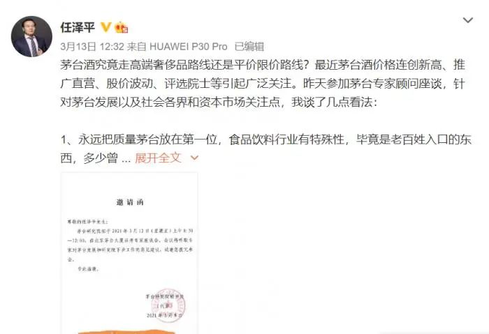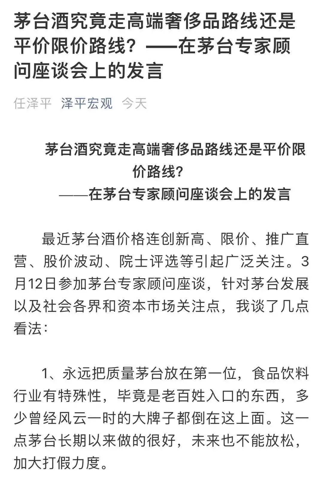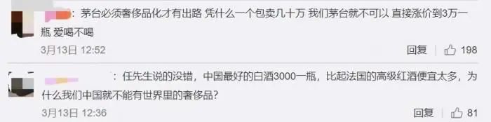 任泽平此言一出,有不少支持者表示,“茅台必须奢侈品化才有出路,凭什么一个包卖几十万,茅台就不可以,直接涨价到3万一瓶,爱喝不喝”、“说的没错,中国最好的白酒才3000一瓶,比法国高级红酒便宜太多”。