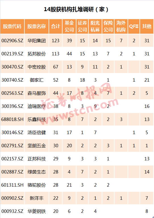 iFinD数据显示,个股方面,华阳集团上周累计接待机构达123家,位居首位;拓邦股份接待113家调研机构,排名第二,中密控股接待67家机构,排名第三位。