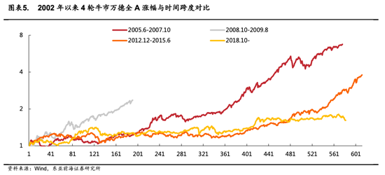 从历轮牛市涨幅来看,当前市场仍然处于相对温和水平。从过去3轮牛市来看,2005年6月-2007年10月牛市市场经历了28个月上涨,涨幅达到568%,2008年10月-2009年8月牛市,市场经历了10个月上涨,涨幅达到136% ,2012年12月-2015年6月牛市,市场经历了30个月上涨,涨幅274%。本轮牛市自2018年10月以来,时间经历了26个月上涨,涨幅仅为62%。