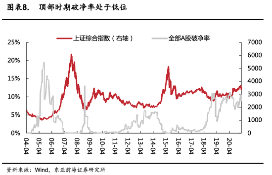 另外一方面,从破净率来看,当前市场仍然处于高位。历史上几轮市场牛市,破净率均会降至0左右,而当前仍有10%左右的上市公司的市值水平低于其账面价值,这也反映了当前市场仍然具有投资价值。