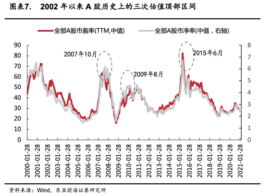 从A股自身价值指标看,当前A股仍然处于安全区域。从估值指标来看,2007年A股见顶期间全部A股PE和PB中位数分别为62倍和6.8倍;2009年A股见顶期间全部A股PE和PB中位数分别为41倍和4.6倍;2015年A股见顶期间全部A股PE和PB中位数分别为82倍和6.7倍;当前全部A股PE和PB中位数分别为27.8倍和2.5倍,远低于市场泡沫时期。