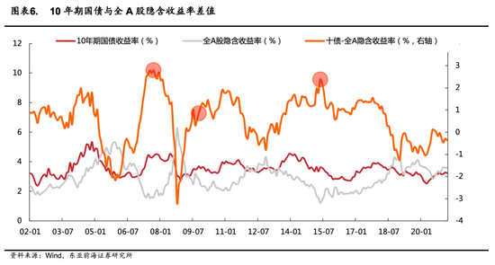 从大类资产配置的价值看,当前A股较债券仍然具有吸引力。如果将A股整体作为一只永续债券,其估值倒数可以视为隐含年化收益率,从历史上看,每轮牛市A股见顶时,其相对于债券的吸引力都处在较高水平,2007年10月,A股隐含收益率为1.59%,较10年期国债的4.39%低2.8个百分点;2009年8月,A股隐含收益率为2.49%,较10年期国债的3.50%低1.01个百分点;2015年5月,A股隐含收益率为1.21%,较10年期国债的3.60%低2.38个百分点。当前来看,A股隐含收益为3.60%,而10年期国债收益率为3.29%,相较于债券,A股当前仍然是更优的资产配置选择。