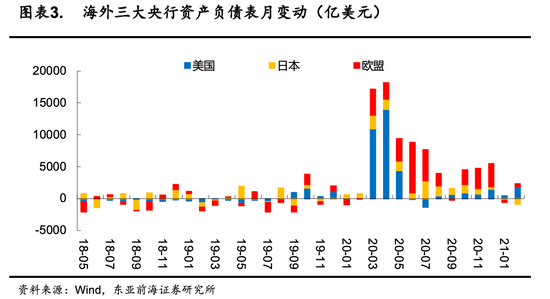 全球主要央行扩大债券购买力度。随着长端收益率的快速上行,主要经济体央行为稳定市场流动性,纷纷扩大资产购买规模,3月1日,澳洲央行宣布将债券购买规模加倍,计划购买超过30亿美元长期债券,3月12日,欧央行在3月议息会议上也承诺加快资产购买步伐以遏制债券收益率上升,虽然美联储没有宣布新的资产购买计划,但是从美联储央行负债表变动来看,2月联储扩表规模1851亿元,远超过1月的415亿元,显示联储仍然实质上投放流动性以支持市场。