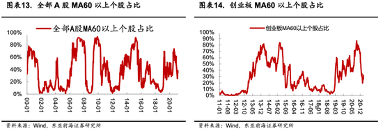 从技术指标来看,当前A股和创业板均处于较低水平。历史上看,全面牛市的终结,往往多数个股均已位于其长期趋势线以上,2007年牛市高点,有91%的个股位于其MA60均线以上,2009年,这一数字为89%,2015年这一数字为90%,而2018年以来,这一指标在2020年8月到达74%以后便直线回落至年前的25.5%,直到节后才从新回升至当前的35.5%。