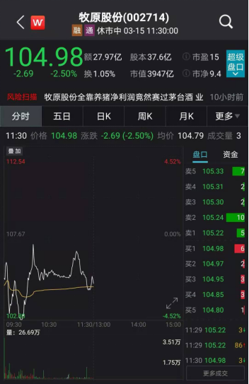 “猪茅”牧原股份低开超2%,盘中跳水一度跌近5%,市值跌破3900亿元。至午间收盘,跌幅收窄至2.5%,报104.98元/股,总市值为3947亿元,半日成交额为27.97亿元,换手率为1.05%。