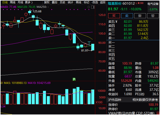 市值超过3000亿元的“光伏茅”隆基股份再次跌停,成交超过90亿元。从2月高点算起,隆基股份股价累计已最多下跌34.78%。3月8日,隆基股份刚经历过一次跌停。