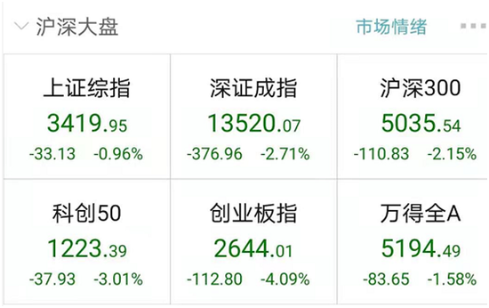 行情数据显示,A股市场几大指数均大幅下挫。上证指数收报3419.95点,下跌33.13点,盘中一度失守3400点大关。