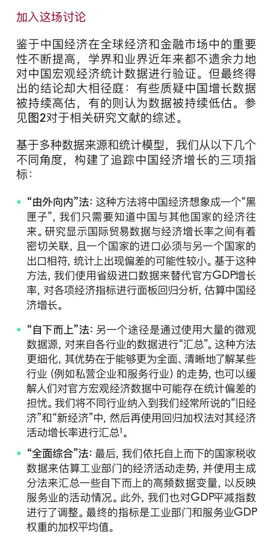 最近几年,随着中国经济的快速崛起,全球人们对于中国经济增长的兴趣越来越浓厚。学界也业界近年来也对中国经济进行了很多验证,但不同的人得出的结果截然不同,有的观点认为中国经济被持续高估,有的恰恰相反,认为中国经济被持续低估。例如,有人认为“中国的实际GDP增速可能不超过官方数据的三分之一”;而有人认为“官方数据可能低估了服务业的规模,服务业可能比官方数据高约20%”。