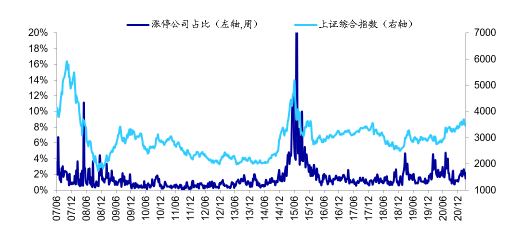 2005年以来涨停股个数占比(五日平滑)高点、低点分别为24%、0%,均值为1.51%,最新一周为1.52%,处在历史上由低到高69%的分位,较前一周的2.24%下降。