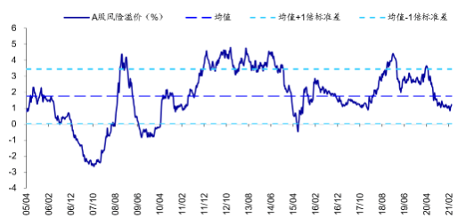 2005年以来A股风险溢价(全部A股PE倒数减十年期国债收益率)高点为4.78%,低点为-2.66%,最新一周风险溢价为1.20%,处在历史上从高到低66%的分位,较前一周的1.09%上升。